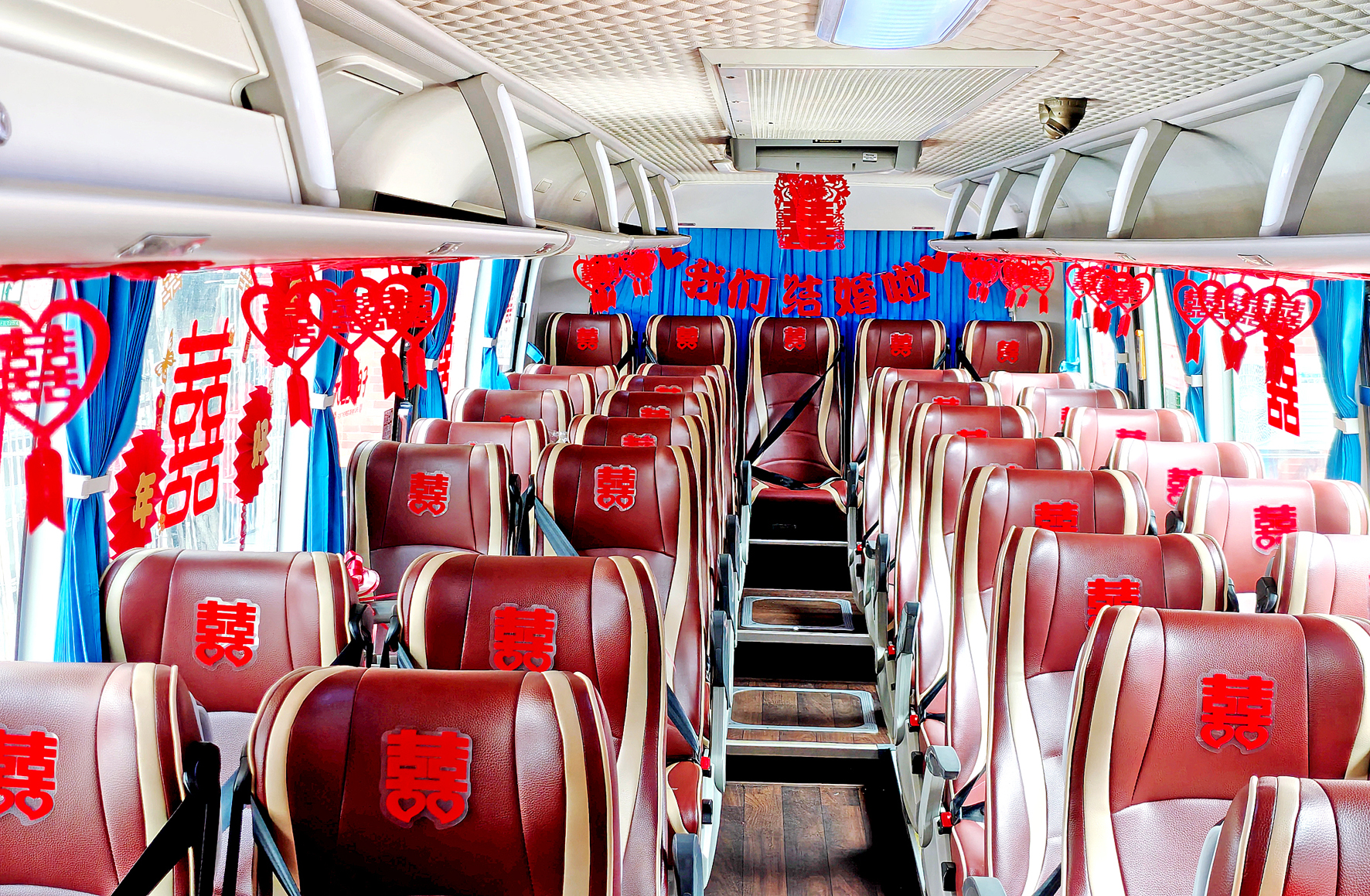 本次包车的新人是十五运相关参与者及体育爱好者,婚礼日期恰与盛会临近,具有双重喜庆意义。从车窗“囍”字剪纸,到座椅和台阶装饰,在三分公司志愿服务队党团员们的精心布置下,“公交婚车”洋溢着喜庆氛围。为增强婚礼的仪式感与纪念意义,接亲路线被特别规划途经三处十五运场馆,使新人在驶向幸福的过程中,也能感受到城市为盛会所做的准备与热情。